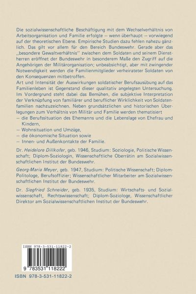 1. Einführung.- 1.1. Einführung in die Problematik.- 1.2. Zur Soldatenfamilie als Forschungsgegenstand.- 2. Versuche einer Annäherung.- 2.1. Zur Berufsausübung des Bundeswehrsoldaten.- 2.2. Zur Soldatenfamilie - historische Anmerkungen.- 2.3. Zur Sozialstruktur von Soldatenfamilien der Bundeswehr.- 3. Das Projekt "Soziale Probleme von Soldatenfamilien".- 3.1. Zum Begriff "Soziale Probleme".- 3.2. Vorgehensweise.- 4. Darstellung der Ergebnisse.- 4.1. Zur Berufssituation des Ehemannes.- 4.2. Zur Lebenslage der Ehefrau.- 4.3. Zur Situation der Kinder.- 4.4. Wohnsituation und Umzüge.- 4.5. Zur ökonomischen Situation.- 4.6. Familiale Interaktion.- 4.7. Soziale Kontakte.- 5. Schluß.- 5.1. Zusammenfassung.- 5.2. Ausblick.- 6. Literaturverzeichnis.