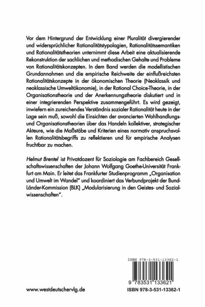 Der Begriff der "Rationalität" steht im Zentrum sozialwissenschaftlicher Analysen. Er gilt als der Schlüsselbegriff der Moderne. Vor dem Hintergrund der Entwicklung einer Pluralität divergierender und widersprüchlicher Rationalitätstypologien, Rationalitätssemantiken und Rationalitätstheorien unternimmt die Arbeit eine aktualisierende Rekonstruktion der sachlichen und methodischen Gehalte und Probleme von Rationalitätskonzepten. In dem Band werden die modellistischen Grundannahmen und die empirische Reichweite der einflußreichsten Rationalitätskonzepte in der ökonomischen Theorie (Neoklassik und neoklassische Umweltökonomie), in der Rational Choice-Theorie, in der Organisationstheorie und der Anerkennungstheorie diskutiert und in einer integrierenden Perspektive zusammengeführt. Es wird gezeigt, inwiefern ein zureichendes Verständnis sozialer Rationalität heute in der Lage sein muß, sowohl die Einsichten der avancierten Wahlhandlungs- und Organisationstheorien über das Handeln kollektiver, strategischer Akteure, wie die Maßstäbe und Kriterien eines normativ anspruchsvollen Rationalitätsbegriffs zu reflektieren und für empirische Analysen fruchtbar zu machen.
