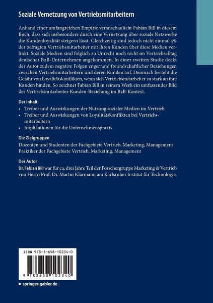 Medien sind zu Unrecht noch nicht im Vertriebsalltag deutscher B2B-Unternehmen angekommen. Anhand einer umfangreichen Empirie veranschaulicht Fabian Bill in diesem Buch, dass sich insbesondere durch eine Vernetzung über soziale Netzwerke die Kundenloyalität steigern lässt. Gleichzeitig sind bisher nicht einmal 5% der Vertriebsmitarbeiter mit ihren Kunden über diese Medien verlinkt. In einer zweiten Studie deckt der Autor zudem negative Folgen enger und freundschaftlicher Beziehungen zwischen Vertriebsmitarbeitern und deren Kunden auf. Demnach besteht die Gefahr von Loyalitätskonflikten, wenn sich Vertriebsmitarbeiter zu stark an ihre Kunden binden. So zeichnet Fabian Bill in seinem Werk ein umfassendes Bild der Vertriebsmitarbeiter-Kunden-Beziehung im B2B-Kontext.