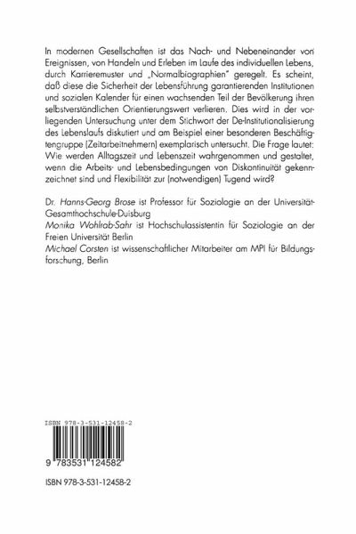I. Einleitung.- Über die Gestaltung von Alltagszeit und Lebenszeit in Zeiten der Diskontinuität und Flexibilität.- II. Die Vermittlung von sozialer Zeit, Lebenszeit und Alltagszeit.- 1. Soziale Zeit: ein erster Annäherungsversuch.- 2. Zeitstrukturen der Lebenswelt: zweite Annäherung.- 3. Koordination und Synchronisation sozialer Zeiten und der Lebenszeit.- 4. Soziale Differenzierung: "Spaltung" der Zeiten sozialer Systeme und gesellschaftliche Zeitsemantik.- 5. Veränderungstendenzen im Bereich sozialer Zeit.- 6. Zusammenfassende und überleitende Betrachtungen: Eine "nicht-mehr-lineare" Konzeption von Zeit.- III. Biographische Entwicklungen in der Zeitarbeit.- 1. Befunde zum (Berufs-)Lebenslauf von Zeitarbeitnehmer/innen.- 2. Biographien in der Zeitarbeit.- 3. Herr Göbel: Über Schwierigkeiten des Beginnens und die Unmöglichkeit, ein Ende zu finden.- 4. Kontrastierung und gedankenexperimentelle Bestimmuung typischer Merkmale.- 5. Der Typus: "Differenz".- 6. Krisenhafte Verläufe und biographische Steuerungsversuche: selektive Reduktion.- 7. Die Gegen-"Option" Einheit: Der Idealisierungstyp.- 8. Vervollständigung der Typenübersicht.- 9. Das Typentableau.- IV. Biographische Zeitperspektiven und zeitbezogenes Erleben und Handeln im Alltag.- 1. Konzeptionelle Klärungen.- 2. Der Zusammenhang von biographischer Zeitperspektive (BZP) und zeitbezogenem Erleben und Handeln im Alltag (ZEHA).- 3. Typische Konstellationen von BZP und ZEHA.- 4. Biographische Zeitperspektive und zeitbezogenes Erleben und Handeln: Weitere typische Konstellationen.- V. Bilder vom eigenen Leben.- 1. Leben als Werk.- 2. Balance (Balanceakt oder Gleichgewicht).- 3. Leben als Kampf.- 4. Aufs falsche Gleis geschoben: Leben als Schicksal.- 5. Leben als endloser Prozeß.- 6. Lebenals subjektive Entfaltung.- 7. Leben als gelebte Fremdheit.- 8. Resümee: Lebensbilder und Muster biographischer Entwicklung.- VI. Lebensarrangements.- 1. Die Verankerung von Zeitarbeit im Lebensarrangement: Separations-, Integrations- und Identitätsmodelle.- 2. Muster des Bezugs auf Intimität und Generativität: Restabilisierung, Auflösung und Verschiebung von Grenzen.- VII. Institutionalisierung und De-Institutionalisierung in den zentralen Lebensbereichen.- 1. "Ungeregelte" Intimität: De-Institutionalisierungsprozesse in den privaten Lebensarrangements von Zeitarbeitskräften.- 2. De-Institutionalisierung und neue Institutionalisierung: Zur Bedeutung der Zeitarbeit als Arbeits- und Beschäftigungsverhältnis.- VIII. Schluß.- IX. Literatur.- X. Anhang.
