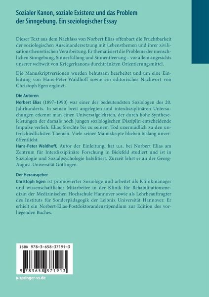 Einleitung von Hans-Peter Waldhoff.- Unvollendete Einleitung von Norbert Elias.- Sozialer Kanon, soziale Existenz und das Problem der Sinngebung. Ein soziologischer Essay.- Editorisches Nachwort des Herausgebers.- Anhang 1: Übersicht des Archivbestands zum Manuskript "Sozialer Kanon und soziale Existenz".- Anhang 2: Vortragsankündigung.- Personenindex.