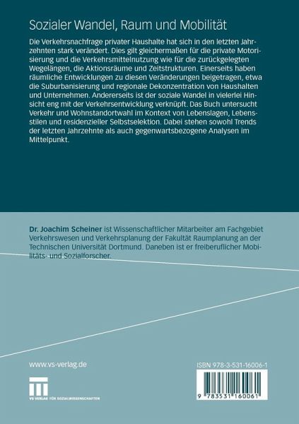 Die Verkehrsnachfrage privater Haushalte hat sich in den letzten Jahrzehnten stark verändert. Dies gilt gleichermaßen für die private Motorisierung und die Verkehrsmittelnutzung wie für die zurückgelegten Wegelängen, die Aktionsräume und Zeitstrukturen. Einerseits haben räumliche Entwicklungen zu diesen Veränderungen beigetragen, etwa die Suburbanisierung und regionale Dekonzentration von Haushalten undUnternehmen. Anderseits ist der soziale Wandel in vielerlei Hinsicht eng mit der Verkehrsentwicklung verknüpft. Das Buch untersucht Verkehr und Wohnstandortwahl im Kontext von Lebenslagen, Lebensstilen und residenzieller Selbstselektion. Dabei stehen sowohl Trends der letzten Jahrzehnte als auch gegenwartsbezogene Analysen im Mittelpunkt.