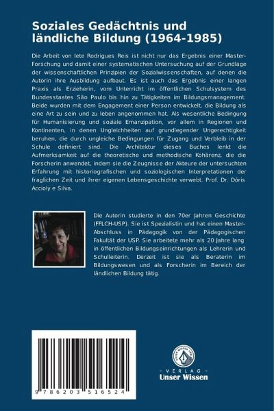 Die Arbeit von Iete Rodrigues Reis ist nicht nur das Ergebnis einer Master-Forschung und damit einer systematischen Untersuchung auf der Grundlage der wissenschaftlichen Prinzipien der Sozialwissenschaften, auf denen die Autorin ihre Ausbildung aufbaut. Es ist auch das Ergebnis einer langen Praxis als Erzieherin, vom Unterricht im öffentlichen Schulsystem des Bundesstaates São Paulo bis hin zu Tätigkeiten im Bildungsmanagement. Beide wurden mit dem Engagement einer Person entwickelt, die Bildung als eine Art zu sein und zu leben angenommen hat. Als wesentliche Bedingung für Humanisierung und soziale Emanzipation, vor allem in Regionen und Kontinenten, in denen Ungleichheiten auf grundlegender Ungerechtigkeit beruhen, die durch ungleiche Bedingungen für Zugang und Verbleib in der Schule definiert sind. Die Architektur dieses Buches lenkt die Aufmerksamkeit auf die theoretische und methodische Kohärenz, die die Forscherin anwendet, indem sie die Zeugnisse der Akteure der untersuchten Erfahrung mit historiografischen und soziologischen Interpretationen der fraglichen Zeit und ihrer eigenen Lebensgeschichte verwebt. Prof. Dr. Dóris Accioly e Silva.