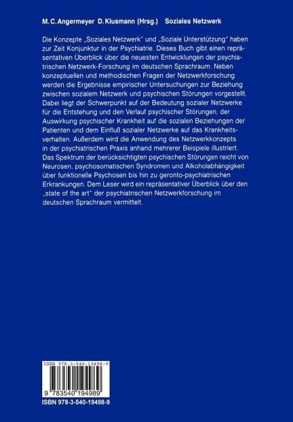 Einführung.- Theorie und Methodik der Netzwerkforschung.- Methoden zur Untersuchung sozialer Unterstützung und persönlicher Netzwerke.- Sozialer Rückhalt und Normalität sozialen Handelns.- Das Mannheimer Interview zur Sozialen Unterstützung: Konstruktion, Erprobung, Anwendungsmöglichkeiten.- Persönliche Netzwerke bei psychotisch Erkrankten. Messung und Beschreibung.- An wen kann ich mich um Hilfe wenden? Soziale Unterstützungssysteme als Ergebnis von Entscheidungen.- Empirische Studien zum sozialen Netzwerk psychisch Kranker.- Soziale Unterstützung, belastende Lebensereignisse und psychogene Erkrankung in einer epidemiologischen Stichprobe.- Soziale Netzwerke und Krankheitsverhalten: Eine Analyse des Umgangs mit psychischen und psychosomatischen Störungen bei jungen Erwachsenen.- Soziale Unterstützung und Suizid: Die unterschiedlichen Funktionen von Verwandten und Bekannten.- Soziales Netzwerk und Schizophrenie: Eine Übersicht.- Persönliche Netzwerke und soziale Unterstützung bei Patienten mit chronisch psychotischen Erkrankungen.- Soziale Isolation, psychische Erkrankung und Altersverlauf. Eine epidemiologische Untersuchung.- Anwendung des Netzwerkansatzes auf die psychiatrische Praxis.- Soziale Netzwerke: Ansatzpunkte psychiatrischer Hilfen.- Soziales Netz und extrahospitaler Hospitalismus - Techniken zur Bewältigung von Isolation.- Erfahrungen aus der Praxis: Die Einbeziehung des sozialen Umfeldes in die Arbeit mit älteren psychisch kranken Menschen.- Selbsthilfe und professionelle Hilfe in der Nachsorgephase bei Abhängigkeitskranken.- Interventionen am sozialen Netzwerk in der Rehabilitation schizophrener Patienten.- Epilog.- Soziales Netzwerk: Ein Konzept für die Psychiatrie?.