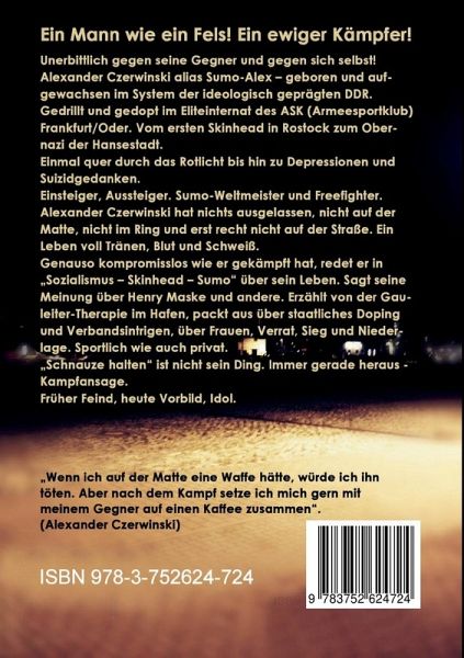 Ein Mann wie ein Fels! Ein ewiger Kämpfer!Alexander Czerwinski alias Sumo Alex.Aufgewachsen in der DDR. Vorzeigeathlet , gedrillt gedopt im Eliteinternat des ASK (Armeesportklub) Frankfurt/Oder.Einmal quer durch das Rotlichtmilieu bis hin zu Depressionen und Suizidgedanken.Einsteiger, Aussteiger. Sumo-Weltmeister mit der Nationalmannschaft und Freefighter. Alexander Czerwinski hat nichts ausgelassen, nicht auf der Matte, nicht im Ring und erst recht nicht auf der Straße. Ein Leben voller Tränen, Blut und Schweiß.Schnauze halten ist nicht sein Ding. Immer gerade heraus - Kampfansage - so wie auch hier in dieser Biografie.