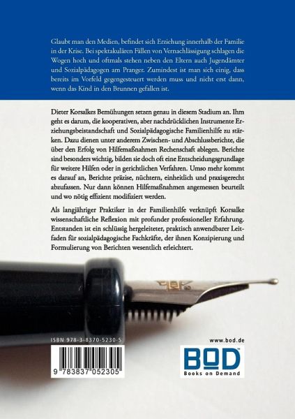 Glaubt man den Medien, befindet sich Erziehung innerhalb der Familie in der Krise. Bei spektakulären Fällen von Vernachlässigung schlagen die Wogen hoch und oftmals stehen neben den Eltern auch Jugendämter und Sozialpädagogen am Pranger. Zumindest ist man sich einig, dass bereits im Vorfeld gegengesteuert werden muss und nicht erst dann, wenn das Kind in den Brunnen gefallen ist.Dieter Korsalkes Bemühungen setzen genau in diesem Stadium an. Ihm geht es darum, die kooperativen, aber nachdrücklichen Instrumente Erziehungsbeistandschaft und Sozialpädagogische Familienhilfe zu stärken. Dazu dienen unter anderem Zwischen- und Abschlussberichte, die über den Erfolg von Hilfemaßnahmen Rechenschaft ablegen. Berichte sind besonders wichtig, bilden sie doch oft eine Entscheidungsgrundlage für weitere Hilfen oder in gerichtlichen Verfahren. Umso mehr kommt es darauf an, Berichte präzise, nüchtern, einheitlich und praxisgerecht abzufassen. Nur dann können Hilfemaßnahmen angemessen beurteilt und wo nötig effizient modifiziert werden.Als langjähriger Praktiker in der Familienhilfe verknüpft Korsalke wissenschaftliche Reflexion mit profunder professioneller Erfahrung. Entstanden ist ein schlüssig hergeleiteter, praktisch anwendbarer Leitfaden für sozialpädagogische Fachkräfte, der ihnen Konzipierung und Formulierung von Berichten wesentlich erleichtert.