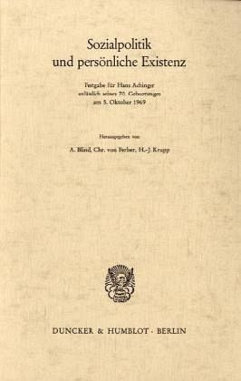 F. Adam, Einkommenshilfe eigener Art / Rente für Berufsunfähige neuer Art - V. Gräfin Bethusy-Huc, Sozialpsychologische Überlegungen zur sozialen Sicherungspolitik - A. Blind, Die Problematik des Begriffs der Bevölkerung in einer sich rasch wandelnden Gesellschaft - W. Bogs, Von der Freiheit durch das Gesetz. Bemerkungen über Anspruchs- und Ermessensleistungen im Sozialrecht - H. Eyferth, Zu einer soziologischen Analyse der Sozialarbeit - C. von Ferber, Der Beitrag der Soziologie zur Sozialreform - R. Gunzert, Kommunale Sozialpolitik - heute - R. Hoernigk, Konzeptionen der Gewährung sozialer Leistungen - K. Jantz, Personalität, Subsidiarität und Solidarität in der sozialen Sicherheit - H.-J. Krupp, Simulationsverfahren in der Sozialpolitik. Ein Beitrag zur sozialwissenschaftlichen Integration? - E. Liefmann-Keil, Dienstleistungen im Gesundheitsbereich. Gibt es einen Pflegenotstand? - H. Muthesius, Die Habilitationsschrift Hans Achingers - O. von Nell-Breuning, Zwischen Arbeitslosigkeit und Überbeschäftigung - O. Neuloh, Sozialplanung und persönliche Freiheit in der Sozialpolitik - L. Neundörfer, Die Vergessenen. Notstände, die von der Sozialgesetzgebung nicht gedeckt sind - L. Preller, Das Bild des Menschen in der Sozialpolitik - H. Pross, Mitbestimmung und Privateigentum - E. Pusic, Social Policy as a Factor of Social Change - D. Schäfer, Die sozialen Dienste im Rahmen einer Systematik der sozialen Hilfen - W. Schreiber, Einige Gedanken zur langfristigen Entwicklung der gesetzlichen Krankenversicherung. Das Idealmodell eines lebenbegleitenden Krankenschutzes