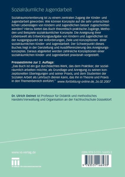 "Die praktischen Beispiele im zweiten Teil des Buches, [...], machen, wie immer bei Ulrich Deinets Büchern Mut, die eigene Arbeit weiterzuentwickeln und neben der pädagogischen Arbeit in den Einrichtungen die sozialpolitische Perspektive der Revitalisierung von Stadtteilen und Regionen nicht aus den Augen zu verliegen." Jugendhilfe aktuell, 01/2006