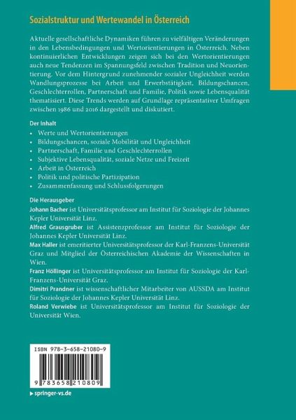 Werte und Wertorientierungen.- Bildungschancen, soziale Mobilität und Ungleichheit.- Partnerschaft, Familie und Geschlechterrollen.- Subjektive Lebensqualität, soziale Netze und Freizeit.- Arbeit in Österreich.- Politik und politische Partizipation.- Zusammenfassung und Schlussfolgerungen.