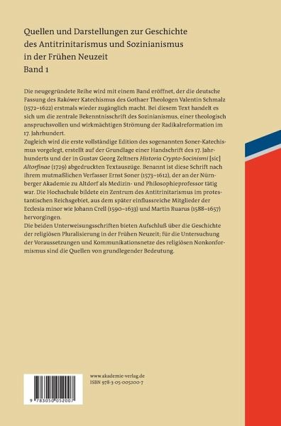 Die neugegründete Reihe wird mit einem Band eröffnet, der die deutsche Fassung des Rakówer Katechismus des Gothaer Theologen Valentin Schmalz (1572-1622) erstmals wieder zugänglich macht. Bei diesem Text handelt es sich um die zentrale Bekenntnisschrift des Sozinianismus, einer theologisch anspruchsvollen und wirkmächtigen Strömung der Radikalreformation im 17. Jahrhundert. Zugleich wird die erste vollständige Edition des sogenannten Soner-Katechismus vorgelegt. Benannt ist diese Schrift nach ihrem mutmaßlichen Verfasser Ernst Soner (1573-1612), der an der Nürnberger Akademie zu Altdorf als Medizin- und Philosophieprofessor tätig war. Die beiden Unterweisungsschriften bieten Aufschluß über die Geschichte der religiösen Pluralisierung in der Frühen Neuzeit; für die Untersuchung der Voraussetzungen und Kommunikationsnetze des religiösen Nonkonformismus sind die Quellen von grundlegender Bedeutung.