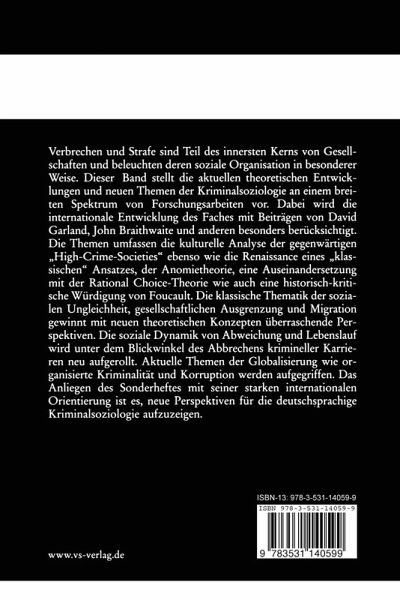 Die Themen umfassen die kulturelle Analyse der gegenwärtigen 'High-Crime-Societies' ebenso wie die Renaissance eines 'klassischen' Ansatzes, der Anomietheorie, eine Auseinandersetzung mit der Rational Choice-Theorie wie auch eine historisch-kritische Würdigung von Foucault. Die klassische Thematik der sozialen Ungleichheit, gesellschaftlichen Ausgrenzung und Migration gewinnt mit neuen theoretischen Konzepten überraschende Per-spektiven. Die soziale Dynamik von Abweichung und Lebenslauf wird unter dem Blickwinkel des Abbrechens krimineller Karrieren neu aufgerollt. Aktuelle Themen der Globalisierung wie organisierte Kriminalität und Korruption werden aufgegriffen. Das Anliegen dieses Sonderheftes mit seiner starken internationalen Orientierung ist es, neue Perspektiven für die deutschsprachige Kriminalsoziologie aufzuzeigen.