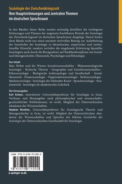 In den Bänden dieser Reihe werden erstmalig detailliert die wichtigsten Strömungen und Themen der ungemein fruchtbaren Periode der Soziologie der Zwischenkriegszeit im deutschen Sprachraum dargelegt. Damit leisten diese Bände nicht nur einen eminent wertvollen Beitrag zur Aufarbeitung der Geschichte der Soziologie in theoretischer, empirischer und institutioneller Hinsicht, sondern vertiefen die eingehende Erörterung Spezieller Soziologien auch durch die Bezugnahme auf Nachbardisziplinen wie Sozial- und Ideengeschichte, Ökonomik, Psychologie und Ethnologie.