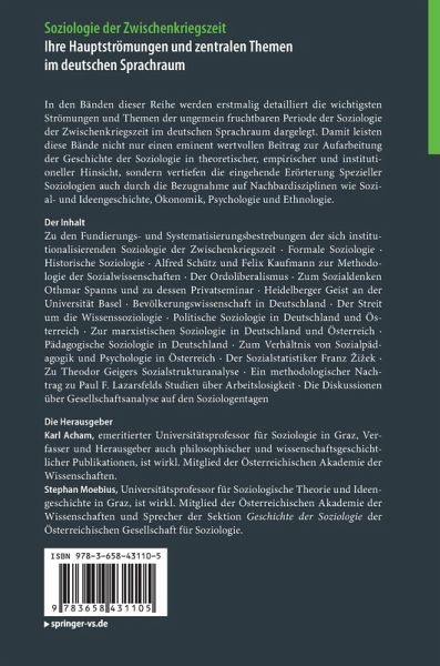 Zu den Fundierungs- und Systematisierungsbestrebungen der sich institutionalisierenden Soziologie der Zwischenkriegszeit.- Formale Soziologie.- Historische Soziologie.- Alfred Schütz und Felix Kaufmann zur Methodologie der Sozialwissenschaften.- Der Ordoliberalismus.- Zum Sozialdenken Othmar Spanns und zu dessen Privatseminar- Heidelberger Geist an der Universität Basel.- Bevölkerungswissenschaft in Deutschland.- Der Streit um die Wissenssoziologie.- Politische Soziologie in Deutschland und Österreich.- Zur marxistischen Soziologie in Deutschland und Österreich.- Pädagogische Soziologie in Deutschland.- Zum Verhältnis von Sozialpädagogik und Psychologie in Österreich.- Der Sozialstatistiker Franz Zizek.- Zu Theodor Geigers Sozialstrukturanalyse.- Ein methodologischer Nachtrag zu Paul F. Lazarsfelds Studien über Arbeitslosigkeit.- Die Diskussionen über Gesellschaftsanalyse auf den Soziologentagen.