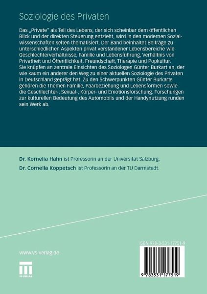 Sie knüpfen an zentrale Einsichten des Soziologen Günter Burkart an, der wie kaum ein anderer den Weg zu einer aktuellen Soziologie des Privaten in Deutschland geprägt hat. Zu den Schwerpunkten Günter Burkarts gehören die Themen Familie, Paarbeziehung und Lebensformen sowie die Geschlechter-, Sexual-, Körper- und Emotionsforschung. Forschungen zur kulturellen Bedeutung des Automobils und der Handynutzung runden sein Werk ab.