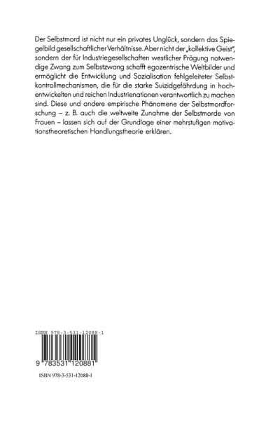 Der Selbstmord ist nicht nur ein privates Ungück, sondern das Spiegelbild gesellschaftlicher Verhältnisse. Aber nicht der "kollektive Geist", sondern der für Industriegesellschaften westlicher Prägung notwendige Zwang zum Selbstzwang schafft egozentrische Weltbilder und ermöglicht die Entwicklung und Sozialisation fehlgeleiteter Selbstkontrollmechanismen, die für die starke Suizidgefährdung in hochentwickelten und reichen Industrienationen verantwortlich zu machen sind. Diese und andere empirische Phänomene der Selbstmordforschung - z. B. auch die weltweite Zunahme der Selbstmorde von Frauen - lassen sich auf der Grundlage einer mehrstufigen motivationstheoretischen Handlungstheorie erklären.