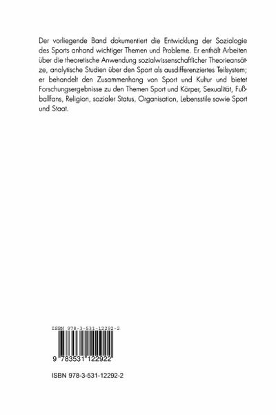 1. Einleitung.- Zum Stand der Soziologie des Sports in der Bundesrepublik Deutschland.- 2. Sport als Gegenstand sozialwissenschaftlicher Paradigmata.- Gegenstand, Methode, Theorie. Wissenschaftstheoretische Anmerkungen zur sozialwissenschaftlichen Analyse des Sports.- Soziales Handeln im sportlichen Verhalten. Ein paradigmatischer und empirischer Begründungsversuch.- Lebensweltliche Ethnographie und das Phänomen Sport.- Die Autonomie des Sports in der modernen Gesellschaft. Eine differenzierungstheoretische Problemskizze.- 3. Strukturelle, politische und religiöse Aspekte des Sports.- Beobachtungs- und Reflexionsdefizite im Sportsystem.- Neokorporatistische Strukturen im Verhältnis von Sport und Staat.- Fußballfans zwischen Verständnis und Verachtung. Kritische Anmerkungen zum Gewaltgutachten der Bundesregierung.- Sport und Religion. Sport als soziale Institution im Dreieck zwischen Zivilreligion, Ersatzreligion und körperlich erlebter Religion.- 4. Sport als Kultur.- Ist Sport Kultur? Versuch, eine 'Gretchenfrage' zu beantworten.- Geld und Sport. Anmerkungen zur tendenziellen Versportung und Monetarisierung unserer kulturellen Wertetafeln.- Bodybuilding als Sinnprovinz der Lebenswelt. Prinzipielle und praktische Bemerkungen.- Fernöstlicher Sport und abendländische Kultur. Tai Chi in Österreich und Taiwan.- 5. Empirische Forschungsergebnisse.- Sportangebote und ihre Organisation in der Wahrnehmung Aktiver.- Disziplinierung des Körpers. Aspekte der somatischen Kultur von Studenten verschiedener Fachrichtungen.- Sport und Sexualität. Zur Konstruktion eines diskursiven Feldes.- Sport als Explorationsfeld soziologischer Kristallisationsforschung. Theoretische Entwürfe und empirische Ergebnisse.- Lebensstil und Sport. Der Sport als stilistische Möglichkeitin der Symbolisierung von Lebensführung.- Leseliste der DGS zur Soziologie des Sports.- Autorenverzeichnis.