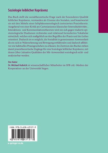 Das Buch stellt die sozialtheoretische Frage nach der besonderen Qualität leiblicher Kopräsenz, verstanden als Urszene des Sozialen, und beantwortet sie mit den Mitteln einer leibphänomenologisch instruierten Praxistheorie. Ausgehend von einer Kritik am Cartesianismus klassischer Intersubjektivitäts-, Interaktions- und Kommunikationstheorien wird ein sich gegen tradierte epistemologische Dualismen richtendes und relational formuliertes Vokabular entwickelt, welches sich maßgeblich an den Begriffen der Praxis und des Leibes orientiert. Dadurch ist es möglich, die Sozialität in gemeinsamer Anwesenheit als ein sich in Wahrnehmung und Bewegung entfaltendes und dadurch affektives wie habituelles Praxisgeschehen zu erfassen. Im Zentrum des Buches stehen damit praxistheoretische Zugänge für eine Soziologie leiblicher Kopräsenz, mit denen (über-)situative Qualitäten der Mit-Anwesenheit soziologisch sicht- und analysierbar werden.
