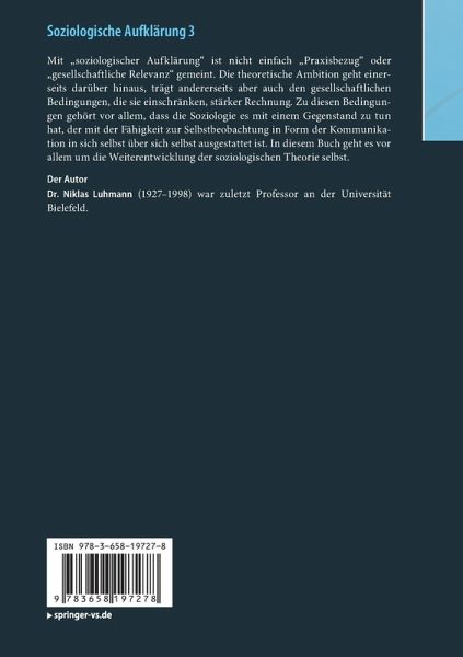 Mit "soziologischer Aufklärung" ist nicht einfach "Praxisbezug" oder "gesellschaftliche Relevanz" gemeint. Die theoretische Ambition geht einerseits darüber hinaus, trägt andererseits aber auch den gesellschaftlichen Bedingungen, die sie einschränken, stärker Rechnung. Zu diesen Bedingungen gehört vor allem, dass die Soziologie es mit einem Gegenstand zu tun hat, der mit der Fähigkeit zur Selbstbeobachtung in Form der Kommunikation in sich selbst über sich selbst ausgestattet ist. In diesem Buch geht es vor allem um die Weiterentwicklung der soziologischen Theorie selbst.