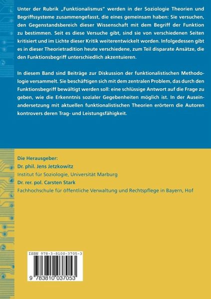 Unter der Rubrik "Funktionalismus" werden in der Soziologie Theorien und Begriffssysteme zusammengefasst, die eines gemeinsam haben: Sie versuchen, den Gegenstandsbereich dieser Wissenschaft mit dem Begriff der Funktion zu bestimmen. Seit es diese Versuche gibt, sind sie von verschiedenen Seiten kritisiert und im Lichte dieser Kritik weiterentwickelt worden. Infolgedessen gibt es in dieser Theorietradition heute verschiedene, zum Teil disparate Ansätze, die den Funktionsbegriff unterschiedlich akzentuieren. In diesem Band sind Beiträge zur Diskussion der funktionalistischen Methodologie versammelt. Sie beschäftigen sich mit dem zentralen Problem, das durch den Funktionsbegriff bewältigt werden soll: eine schlüssige Antwort auf die Frage zu geben, wie die Erkenntnis sozialer Gegebenheiten möglich ist. In der Auseinandersetzung mit aktuellen funktionalistischen Theorien erörtern die Autoren kontrovers deren Trag- und Leistungsfähigkeit.
