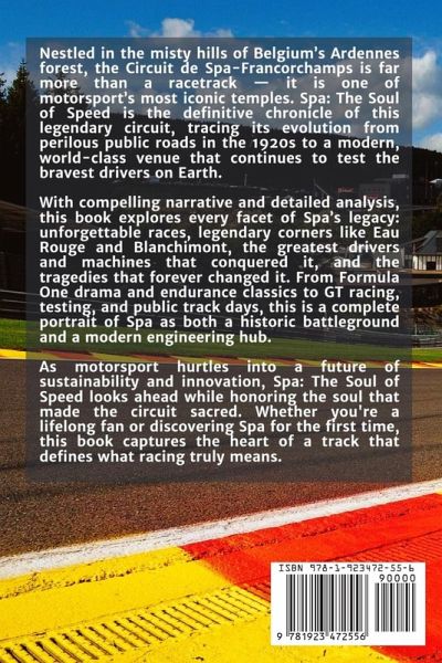 Nestled in the misty hills of Belgium's Ardennes forest, the Circuit de Spa-Francorchamps is far more than a racetrack - it is one of motorsport's most iconic temples. Spa: The Soul of Speed is the definitive chronicle of this legendary circuit, tracing its evolution from perilous public roads in the 1920s to a modern, world-class venue that continues to test the bravest drivers on Earth. With compelling narrative and detailed analysis, this book explores every facet of Spa's legacy: unforgettable races, legendary corners like Eau Rouge and Blanchimont, the greatest drivers and machines that conquered it, and the tragedies that forever changed it. From Formula One drama and endurance classics to GT racing, testing, and public track days, this is a complete portrait of Spa as both a historic battleground and a modern engineering hub. As motorsport hurtles into a future of sustainability and innovation, Spa: The Soul of Speed looks ahead while honoring the soul that made the circuit sacred. Whether you're a lifelong fan or discovering Spa for the first time, this book captures the heart of a track that defines what racing truly means.