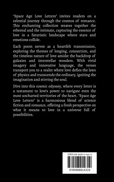 "Space Age Love Letters" invites readers on a celestial journey through the cosmos of romance. This enchanting collection weaves together the ethereal and the intimate, capturing the essence of love in a futuristic landscape where stars and emotions collide. Each poem serves as a heartfelt transmission, exploring the themes of longing, connection, and the timeless nature of love amidst the backdrop of galaxies and interstellar wonders. With vivid imagery and innovative language, the verses transport you to a realm where love defies the laws of physics and transcends the ordinary, igniting the imagination and stirring the soul. Dive into this cosmic odyssey, where every letter is a testament to love's power to navigate even the most uncharted territories of the heart. "Space Age Love Letters" is a harmonious blend of science fiction and romance, offering a fresh perspective on what it means to love in a universe full of possibilities.