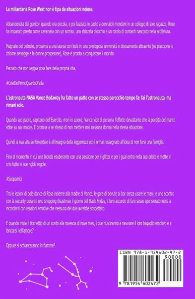 La miliardaria Rose West non è tipa da situazioni noiose. Abbandonata dai genitori quando era piccola, e poi lasciata in pasto a donnaioli mondani in un collegio di sole ragazze, Rose ha imparato presto come cavarsela con un sorriso, una strizzata d'occhio e un rotolo di contanti nascosto nella scollatura. Magnate del petrolio, prossima a una laurea con lode in una prestigiosa università e decisamente attraente (se piacciono le chiome selvagge e le donne prosperose), Rose è pronta a conquistare il mondo. Peccato che non sappia cosa fare della propria vita. #CrisiDelPrimoQuartoDiVita L'astronauta NASA Vance Bodaway ha fatto un patto con se stesso parecchio tempo fa: fai l'astronauta, ma rimani solo. Quando suo padre, capitano dell'Esercito, morì in azione, Vance vide di persona l'effetto devastante che la perdita del marito ebbe su sua madre. E promise a se stesso di non mettere mai nessuna donna nella stessa situazione. Quindi la sua vita sentimentale è all'insegna della leggerezza ed è ormai rassegnato all'idea di non farsi una famiglia. Fino al momento in cui una bionda esuberante con una passione per il glitter e per i guai entra nella sua orbita e mette in crisi tutte le sue rigide regole. #Scopamici Tra le lezioni di pole dance di Rose insieme alla madre di Vance, le gare di bevute al bar senza usare le mani, e uno scontro con la security durante uno shopping disastroso il giorno del Black Friday, il loro accordo di fare sesso spensierato inizia a incrociarsi con reazioni emotive che nessuno dei due avrebbe sospettato. E quando inizia il ticchettio di un conto alla rovescia di nove mesi, i due riusciranno a riavviare il loro bagaglio emotivo e a lanciarsi nell'amore? Oppure si schianteranno in fiamme?