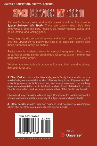 It's time for funny, clean, kid-friendly poems. You'll find loads inside Space Between My Teeth. There are poems about life's little annoyances, pets and pals, house rules, money matters, aches and pains, eating, and looking good. Enjoy laughing at common kid sayings and antics. If you're a kid, you'll love this upbeat comic poetry. But kids of all ages can identify with these humorous family life poems. Recite them for a talent show or for a school assignment. Read them at parties or during school break times. Cheer up a sick friend or just memorize some for fun. Whether you want to laugh by yourself or read them aloud to others, this book is for you.