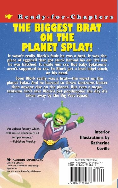 It really wasn't Blork's fault he was a brat. It was the piece of eggshell that got stuck behind his ear the day he was hatched. It made him cry. But baby Splatoons aren't supposed to cry. So Blork got a brat label stuck on his head. Soon Blork really was a brat - the worst on the planet Splat. And he learned to throw tantrums better than anyone else on the planet. But even a mega-tantrum can't save Blork's pet poodnoobie the day it's taken away by the Big Pest Squad.