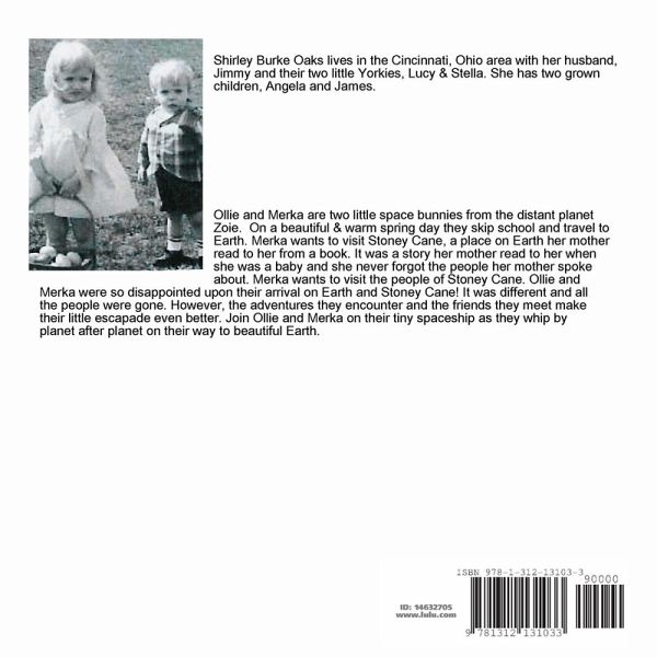 Ollie and Merka are two little space bunnies from the distant planet Zoie. On a beautiful & warm spring day they skip school and travel to Earth. Merka wants to visit Stoney Cane, a place on Earth her mother read to her from a book. It was a story her mother read to her when she was a baby and she never forgot the people her mother spoke about. Merka wants to visit the people of Stoney Cane. Ollie and Merka were so disappointed upon their arrival on Earth and Stoney Cane! It was different and all the people were gone. However, the adventures they encounter and the friends they meet make their little escapade even better. Join Ollie and Merka on their tiny spaceship as they whip by planet after planet on their way to beautiful Earth.