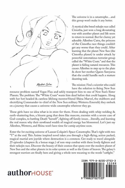 The universe is in a catastrophe...and this group won't make it any better. A mystical elite breed nekojin race called Cimotha, just won a long devastating war with another planet and life seem to return to normal. But for clumsy yet adorable Allenbee Catra, the princess of the Cimotha race things couldn't get any worse than they could. After learning that the planet New Sun (the Cimotha planet) is under attack by powerful ostentatious terrorist group called the "White Coats." and that the planet is failing natural resources. This causes Allenbee to step up to the plate & show her mother Queen Sawyarna that she could handle such a mature daunting task. The mission: Find a scientist who could have the solution to fixing New Sun resource problem named Vegas Flux and safely transport him to one of New Sun's Sister Planets. The problem: The "White Coats" wants him dead before that could happen. Along with her hot headed & careless lifelong mentor/friend Shina Marvel, the stubborn and electrifying Commander-in-chief of the New Sun military Wetterra Emerald; they embark on a journey that causes a universe-wide catastrophe wherever they go. These girls have no idea what is in store for them. From dealing with whip welding & earth-shattering foes, a bizarre gang that dress like mascots, enemies with a severe case of God-complex, to battling Death "herself ", fighting off family issues...literally, and learning the real reason why their newfound wealth of magical energy has blossomed. Let's just say Allenbee, Wetterra, and Shina won't have time for catnip anytime soon. Enter the 1st exciting universe of Lasean Colquitt's Space Catastrophe. That's right with two "T" at the end. This Anime inspired novel takes you through a high-flying, action packed, magical martial arts joyride where destruction is a common. Get ready to travel alongside 25 episodes (chapters & a bonus stage.) of non-stop combat with these lovely fighters and their nekojin race. Discover the beauty of their cosmos that spans over the modern planet of New Sun and the other planets in its solar system as well as the Gates of heaven. The galaxy's strongest warriors are finally here and giving a whole new meaning to the words "catfight."