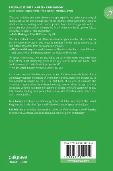 As humans expand the frequency and scale of interactions off-planet, Space Criminology ponders the nature of crime, harm and transgression in outer space and possible responses to these. The first book of its kind, it discusses the dynamics of space crime, from those involving powerful elites through to those associated with the mundane interactions of people living and working in space. It is essential reading for anyone interested in extra-terrestrial crime, space law, and criminal justice.