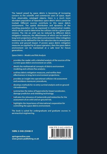 In Space Debris Models and Risk Analysis the authors will provide the reader with a comprehensive background to understand the various sources of space debris, and to assess associated risks due to the current and future space debris environment. Apart from the non-trackable objects produced by historic on-orbit fragmentation events, several other sources of space debris will be outlined. Models will be described to allow the generation and propagation of the different debris families and permit the assessment of the associated collision risk on representative target orbits for present and future conditions. Using traffic models and possible mitigation practices, the future evolution of the space debris environment will be forecast. For large-size, trackable objects methods will be described for conjunction event predictions and related risk assessments. For hazardous re-entry objects, procedures will be outlined to enable the prediction of re-entry times and likely impact areas, to assess uncertainties in these factors, and to quantify the risk due to ground impact. Models will also be described for meteoroids, which prevail over space debris at small particle sizes.