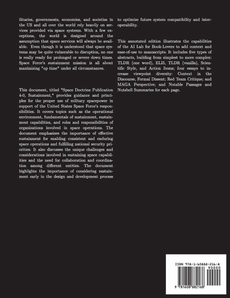 Militaries, governments, economies, and societies in the US and all over the world rely heavily on services provided via space systems. With a few exceptions, the world is designed around the assumption that space services will always be available. Even though it is understood that space systems may be quite vulnerable to disruption, no one is really ready for prolonged or severe down times. Space Force's sustainment mission is all about maximizing "up time" under all circumstances. This document, titled "Space Doctrine Publication 4-0, Sustainment," provides guidance and principles for the proper use of military spacepower in support of the United States Space Force's responsibilities. It covers topics such as the operational environment, fundamentals of sustainment, sustainment capabilities, and roles and responsibilities of organizations involved in space operations. The document emphasizes the importance of effective sustainment for enabling consistent and enduring space operations and fulfilling national security priorities. It also discusses the unique challenges and considerations involved in sustaining space capabilities and the need for collaboration and coordination among different entities. The document highlights the importance of considering sustainment early in the design and development process to optimize future system compatibility and interoperability. This annotated edition illustrates the capabilities of the AI Lab for Book-Lovers to add context and ease-of-use to manuscripts. It includes six types of abstracts, building from simplest to more complex: TLDR (one word), ELI5, TLDR (vanilla), Scientific Style, Action Items and Visual; four essays to increase viewpoint diversity: Context in the Discourse, Formal Dissent; Red Team Critique; and MAGA Perspective; and Notable Passages and Nutshell Summaries for each page.