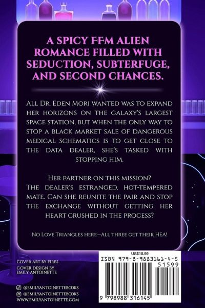 All Dr. Eden Mori wanted was to expand her horizons on the galaxy's largest space station, but when the only way to stop a black market sale of dangerous medical schematics is to get close to the data dealer, she's tasked with stopping him. Her partner on this mission? The dealer's estranged, hot-tempered mate. Can she reunite the pair and stop the exchange without getting her heart getting crushed in the process? Space for More is a FFM alien romance filled with seduction, subterfuge, and second chances. No love triangles here-all three get their HEA! Space for More is Book 2 in the Spire Station series of interconnected standalone alien romances.