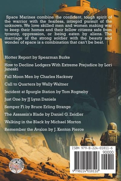Space Marines combine the confident, tough spirit of the warrior with the fearless, intrepid pursuit of the unknown. We love skilled men and women making war to keep their homes and their fellow citizens safe from tyranny, oppression, or being eaten by aliens. The marriage of the strong soldier with the beauty and wonder of space is a combination that can't be beat. Blotter Report by Spearman Burke How to Decline Lodgers With Extreme Prejudice by Lori Janeski Full Moon Men by Charles Hackney Call to Quarters by Wally Waltner Incident at Spurgle Station by Tom Rogneby Just One by JJ Lynn Daniels Semper Fi by Bruce Erling Strange The Assassin's Blade by Daniel G. Zeidler Walking in the Black by Michael Morton Remember the Avalon by J. Kenton Pierce