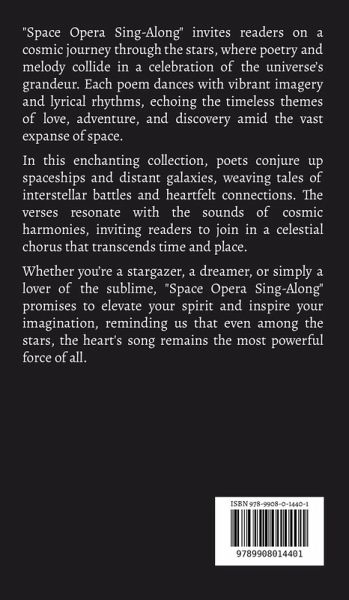 "Space Opera Sing-Along" invites readers on a cosmic journey through the stars, where poetry and melody collide in a celebration of the universe's grandeur. Each poem dances with vibrant imagery and lyrical rhythms, echoing the timeless themes of love, adventure, and discovery amid the vast expanse of space. In this enchanting collection, poets conjure up spaceships and distant galaxies, weaving tales of interstellar battles and heartfelt connections. The verses resonate with the sounds of cosmic harmonies, inviting readers to join in a celestial chorus that transcends time and place. Whether you're a stargazer, a dreamer, or simply a lover of the sublime, "Space Opera Sing-Along" promises to elevate your spirit and inspire your imagination, reminding us that even among the stars, the heart's song remains the most powerful force of all.