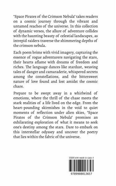"Space Pirates of the Crimson Nebula" takes readers on a cosmic journey through the vibrant and untamed reaches of the universe. In this collection of dynamic verses, the allure of adventure collides with the haunting beauty of celestial landscapes, as intrepid raiders traverse the shimmering depths of the crimson nebula. Each poem brims with vivid imagery, capturing the essence of rogue adventurers navigating the stars, their hearts aflame with dreams of freedom and riches. The language dances like stardust, weaving tales of danger and camaraderie, whispered secrets among the constellations, and the bittersweet nature of love found and lost amidst the cosmic chaos. Prepare to be swept away in a whirlwind of emotions, where the thrill of the chase meets the stark realities of a life lived on the edge. From the heart-pounding skirmishes in the void to quiet moments of reflection under alien skies, "Space Pirates of the Crimson Nebula" promises an exhilarating exploration of what it means to seek one's destiny among the stars. Dare to embark on this interstellar odyssey and uncover the poetry that lies within the fabric of the universe.