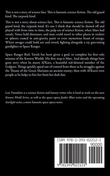 This is not a story about science fact. This is fantastic science fiction. The old guard kind, the raypunk kind. It's one I think that should be dusted off and played with from time to time; the pulp era of science fiction, when Mars had canals, Venus held dinosaurs, and man could travel to other places in rockets or spheres coated in anti-gravity paint or even mysterious beam of energy. Where savages could hold axe and sword, fighting alongside a ray gun-toting gunfighter or Space Ranger. Space Ranger Rick Tavish has been given a goal, to complete his first solo mission of the Known Worlds. His first stop is Mars. And already things have gone awry when he meets Al'Kara, a beautiful red-skinned member of the Golgoro. Things quickly spiral out of control from there as he struggles against the Thrane of the Green Martians an ancient enemy; then with Al'Kara's own people as he helps to free her from her dark fate.