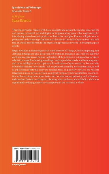 This book provides readers with basic concepts and design theories for space robots and presents essential methodologies for implementing space robot engineering by introducing several concrete projects as illustrative examples. Readers will gain a comprehensive understanding of professional theories in the field of space robots, and will find an initial introduction to the engineering processes involved in developing space robots. Rapid advances in technologies such as the Internet of Things, Cloud Computing, and Artificial Intelligence have also produced profound changes in space robots. With the continuous expansion of human exploration of the universe, it is imperative for space robots to be capable of sharing knowledge, working collaboratively, and becoming more and more intelligent so as to optimize the utilization of space resources. For on-orbit robots that perform service tasks such as spacecraft assembly and maintenance, as well as explorationrobots that carry out research tasks on planetary surfaces, the rational integration into a network system can greatly improve their capabilities in connection with executing outer space tasks, such as information gathering and utilization, independent decision-making and planning, risk avoidance, and reliability, while also significantly reducing resource consumption for the system as a whole.