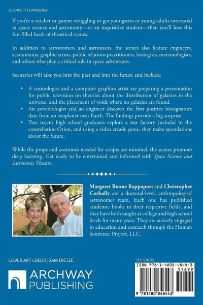 If you’re a teacher or parent struggling to get youngsters or young adults interested in space science and astronomy—or an inquisitive student—then you’ll love this fun-filled book of theatrical scenes. In addition to astronomers and astronauts, the scenes also feature engineers, accountants, graphic artists, public relations practitioners, biologists, meteorologists, and others who play a critical role in space adventures. Scenarios will take you into the past and into the future and include: • A cosmologist and a computer graphics artist are preparing a presentation for public television on theories about the distribution of galaxies in the universe, and the placement of voids where no galaxies are found. • An astrobiologist and an engineer discover the first positive biosignature data from an exoplanet near Earth. The findings provide a big surprise. • Two recent high school graduates explore a star factory (nebula) in the constellation Orion, and using a video arcade game, they make speculations about the future. While the props and costumes needed for scripts are minimal, the scenes promote deep learning. Get ready to be entertained and informed with Space Science and Astronomy Theatre.