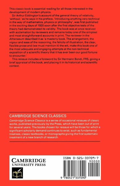 This classic book is essential reading for all those interested in the development of modern physics. Sir Arthur Eddington's account of the general theory of relativity, 'without, ' as he says in his preface, 'introducing anything very technical in the way of mathematics, physics or philosophy', was first published in the exciting days of 1920 soon after the first objective tests of the theory had demonstrated its validity. The book was at once received with acclamation by reviewers and remains today one of the simplest and most straightforward accounts in print. The reviewer in the Athenaeum described it as a 'masterly book. The arrangement, the vigour and ease of reasoning, the felicity of illustration, the clear, flexible prose and (we must mention it) the wit, make this book one of the most adequate and engaging attempts at the non-technical exposition of a scientific theory that it has ever been our good fortune to encounter.' The reissue includes a foreword by Sir Hermann Bondi, FRS, giving a brief appraisal of the book, and placing it in its historical and scientific context.