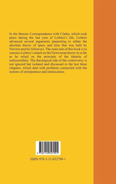 The main aim of this book is to reassess Leibniz's attack on the Newtonian theory in so far as he relied on the principle of the identity of indiscernibles. The theological side of the controversy is not ignored but isolated and discussed in the last three chapters, which deal with problems connected with the notions of omnipotence and omniscience.