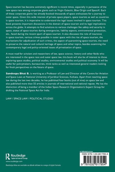 Space tourism has become extremely significant in recent times, especially in pursuance of the new space race among corporate giants such as Virgin Galactic, Blue Origin and SpaceX. Each of these corporate giants has already booked thousands of space enthusiasts for a journey to outer space. Given this wide interest of private space players, space tourists as well as countries in space tourism, it is imperative to understand the legal issues involved in space tourism. This book presents important discussions in the domain of space tourism and its legal implications across the globe. It attempts to find solutions to various challenges like safety and security in space, status of space tourists during emergencies, liability aspects, environmental protection, etc., faced during the recent spurt of space tourism. It also discusses the role of insurance in space tourism, various crimes possible in outer space with the rise of space tourism, the mechanisms for adjudication of such crimes, the aspect of quarantining space tourists, the need to preserve the natural and cultural heritage of space and other topics, besides examining the contemporary legal and policy-oriented issues of privatisation of space.