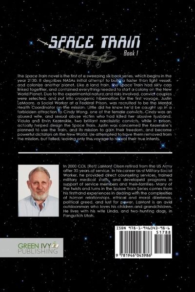 The Space Train novel is the first of a sweeping six book series, which begins in the year 2130. It describes NASAs initial attempt to build a faster than light vessel, and colonize another planet. Like a land train, the Space Train had sixty cars linked together, and contained everything needed to start a colony on the New World Planet. Due to the experimental nature and risks involved, convict couples were selected, and put into cryogenic hibernation for the first voyage. Justin LeMoore, a Social Worker at a Federal Prison, was recruited to be the Mental Health Coordinator on the mission. Little did he know he'd be caught up in a forbidden attraction to Cindy Wong, one of the female convicts. Cindy was an abused wife, and sexual abuse victim who had killed her abusive husband. Vidula and Ervin Kezenskie, two brilliant narcissistic convicts, while in prison, actually helped design the Space Train. Justin was concerned the Kezenskie's planned to use the Train, and its mission to gain their freedom, and become powerful dictators on the New World. He attempted to have them removed from the mission, but failed, leaving only the voyage to reveal their true intents.