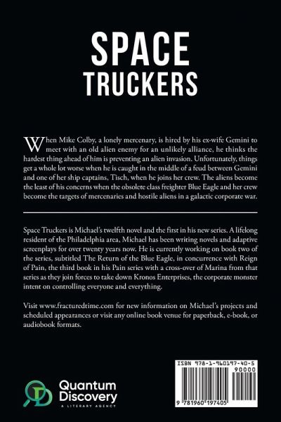 When Mike Colby, a lonely mercenary, is hired by his ex-wife Gemini to meet with an old alien enemy for an unlikely alliance, he thinks the hardest thing ahead of him is preventing an alien invasion. Unfortunately, things get a whole lot worse when he is caught in the middle of a feud between Gemini and one of her ship captains, Tisch, when he joins her crew. The aliens become the least of his concerns when the obsolete class freighter Blue Eagle and her crew become the targets of mercenaries and hostile aliens in a galactic corporate war. Space Truckers is Michael's twelfth novel and the first in his new series. A lifelong resident of the Philadelphia area, Michael has been writing novels and adaptive screenplays for over twenty years now. He is currently working on book two of the series, subtitled The Return of the Blue Eagle, in concurrence with Reign of Pain, the third book in his Pain series with a cross-over of Marina from that series as they join forces to take down Kronos Enterprises, the corporate monster intent on controlling everyone and everything. Visit www.fracturedtime.com for new information on Michael's projects and scheduled appearances or visit any online book venue for paperback, e-book, or audiobook formats.