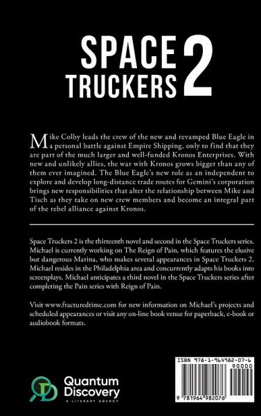 Mike Colby leads the crew of the new and revamped Blue Eagle in a personal battle against Empire Shipping, only to find that they are part of the much larger and well-funded Kronos Enterprises. With new and unlikely allies, the war with Kronos grows bigger than any of them ever imagined. The Blue Eagle's new role as an independent to explore and develop long-distance trade routes for Gemini's corporation brings new responsibilities that alter the relationship between Mike and Tisch as they take on new crew members and become an integral part of the rebel alliance against Kronos. Space Truckers 2 is the thirteenth novel and second in the Space Truckers series. Michael is currently working on The Reign of Pain, which features the elusive but dangerous Marina, who makes several appearances in Space Truckers 2. Michael resides in the Philadelphia area and concurrently adapts his books into screenplays. Michael anticipates a third novel in the Space Truckers series after completing the Pain series with Reign of Pain. Visit www.fracturedtime.com for new information on Michael's projects and scheduled appearances or visit any on-line book venue for paperback, e-book or audiobook formats.