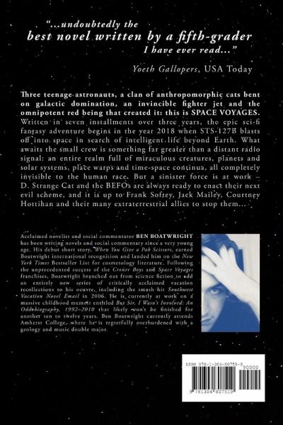 Three teenage astronauts, a clan of anthropomorphic cats bent on galactic domination, an invincible fighter jet and the omnipotent red being that created it: this is SPACE VOYAGES. Written in seven installments over three years, the epic sci-fi fantasy adventure begins in the year 2018 when STS-127B blasts off into space in search of intelligent life beyond Earth. What awaits the small crew is something far greater than a distant radio signal: an entire realm full of miraculous creatures, planets and solar systems, place warps and time-space continua, all completely invisible to the human race. But a sinister force is at work - D. Strange Cat and the BEFOs are always ready to enact their next evil scheme, and it is up to Frank Softey, Jack Mailey, Courtney Hottihan and their many extraterrestrial allies to stop them...