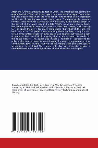After the Chinese anti-satellite test in 2007, the international community responded with fear that a new space race was soon to begin. Soon after the test, debate began on the need for an arms control treaty specifically for the use of banning weapons in outer space. The argument for an arms control treaty for outer space is not new however, as the debate began at the advent of the space race in the late 1950 s. As no arms control treaty has been implemented in over 55 years it is clear that creating such a treaty for the space theatre is far more complicated than that of the sea, the land, or the air. This paper looks into why there has been a requirement for an arms control treaty for outer space, and analyses why creating such a treaty has been so difficult, arguing that a new approach is needed in the space debate. This paper also makes a number of suggestions for policy makers and scholars who are looking for ways to implement positive contributions towards the security of space, where traditional arms control techniques have failed. This paper will also suit students seeking a comprehensive work on the problems of arms control in outer space.