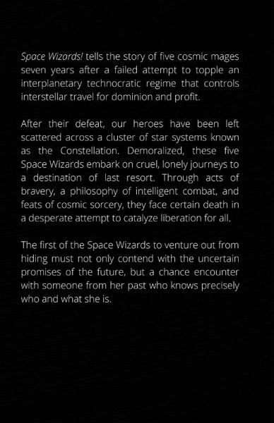 Space Wizards! tells the story of five cosmic mages a dozen years after a failed attempt to topple a technocracic regime that ruthlessly controls all interstellar travel and activity for dominion and profit. After their defeat, our heroes have been left scattered across a cluster of star systems known as the Constellation. Demoralized, these five survivors embark on cruel, lonely journeys to a destination of last resort. Through acts of bravery, a philosophy of intelligent combat, and feats of cosmic sorcery, they face certain death in a desperate attempt to catalyze liberation for all. The first of the Space Wizards to venture out from hiding must not only contend with the uncertain promises of the future, but a chance encounter with someone from her past who knows precisely who and what she is.