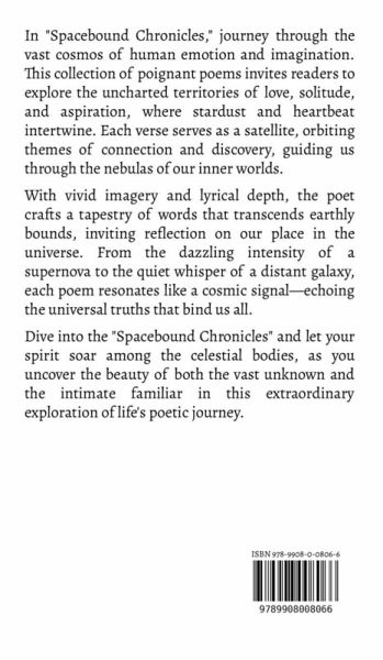 In "Spacebound Chronicles," journey through the vast cosmos of human emotion and imagination. This collection of poignant poems invites readers to explore the uncharted territories of love, solitude, and aspiration, where stardust and heartbeat intertwine. Each verse serves as a satellite, orbiting themes of connection and discovery, guiding us through the nebulas of our inner worlds. With vivid imagery and lyrical depth, the poet crafts a tapestry of words that transcends earthly bounds, inviting reflection on our place in the universe. From the dazzling intensity of a supernova to the quiet whisper of a distant galaxy, each poem resonates like a cosmic signal-echoing the universal truths that bind us all. Dive into the "Spacebound Chronicles" and let your spirit soar among the celestial bodies, as you uncover the beauty of both the vast unknown and the intimate familiar in this extraordinary exploration of life's poetic journey.